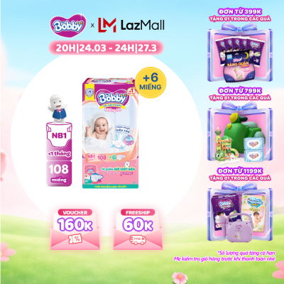 Miếng lót sơ sinh Bobby gói lớn Newborn 1-108 miếng (0-5kg) + Tặng kèm 6 miếng tã quần mở 1 bên Bobby size NB / NB-S