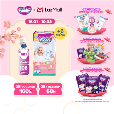 Miếng lót sơ sinh Bobby gói lớn Newborn 1-108 miếng (0-5kg) + Tặng kèm 6 miếng tã quần mở 1 bên Bobby size NB / NB-S
