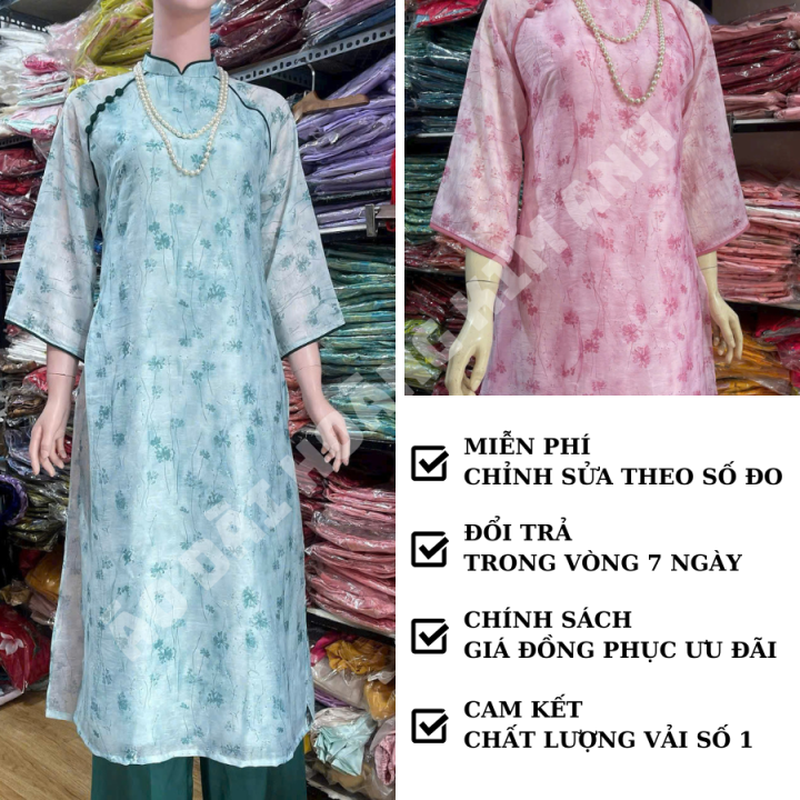 Áo dài cách tân nữ 4 tà lụa voan tơ mềm mại hoạ tiết hoa chìm 4 tà viền cổ và tay đính cúc vai đẹp màu Hồng Xanh